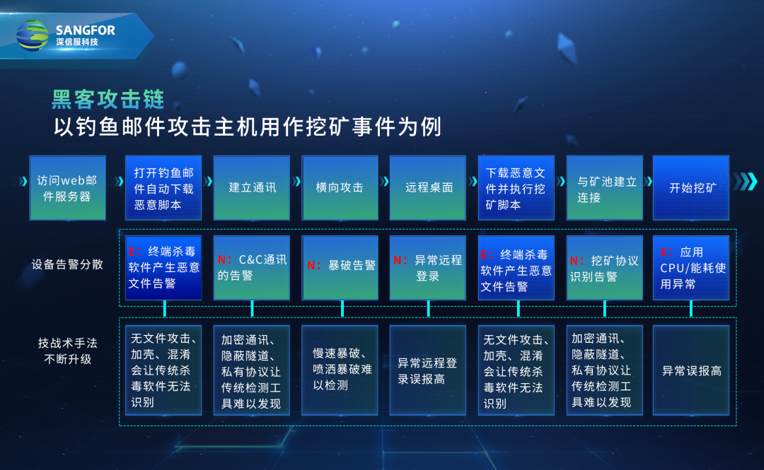 惡意黑客的攻擊也是如此,通常以網(wǎng)絡(luò)(N:Network)、終端(E:Endpoint)行為為主。過去,每一步攻擊行為對應(yīng)終端殺軟和流量檢測設(shè)備會分別告警,但網(wǎng)端兩側(cè)告警無法進行深度關(guān)聯(lián)分析,由此產(chǎn)生大量告警信息,而無法生成安全事件。