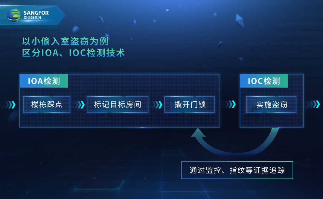 如何理解IOA與IOC檢測技術(shù)?同樣以小偷入室盜竊為例,IOA檢測技術(shù)代表著小區(qū)安保能夠發(fā)現(xiàn)小偷踩點、標(biāo)記、撬開門鎖的行為,及時制止小偷的盜竊行為,而IOC檢測技術(shù)則代表著小偷實施盜竊后,通過監(jiān)控、指紋等證據(jù)追蹤抓到小偷。