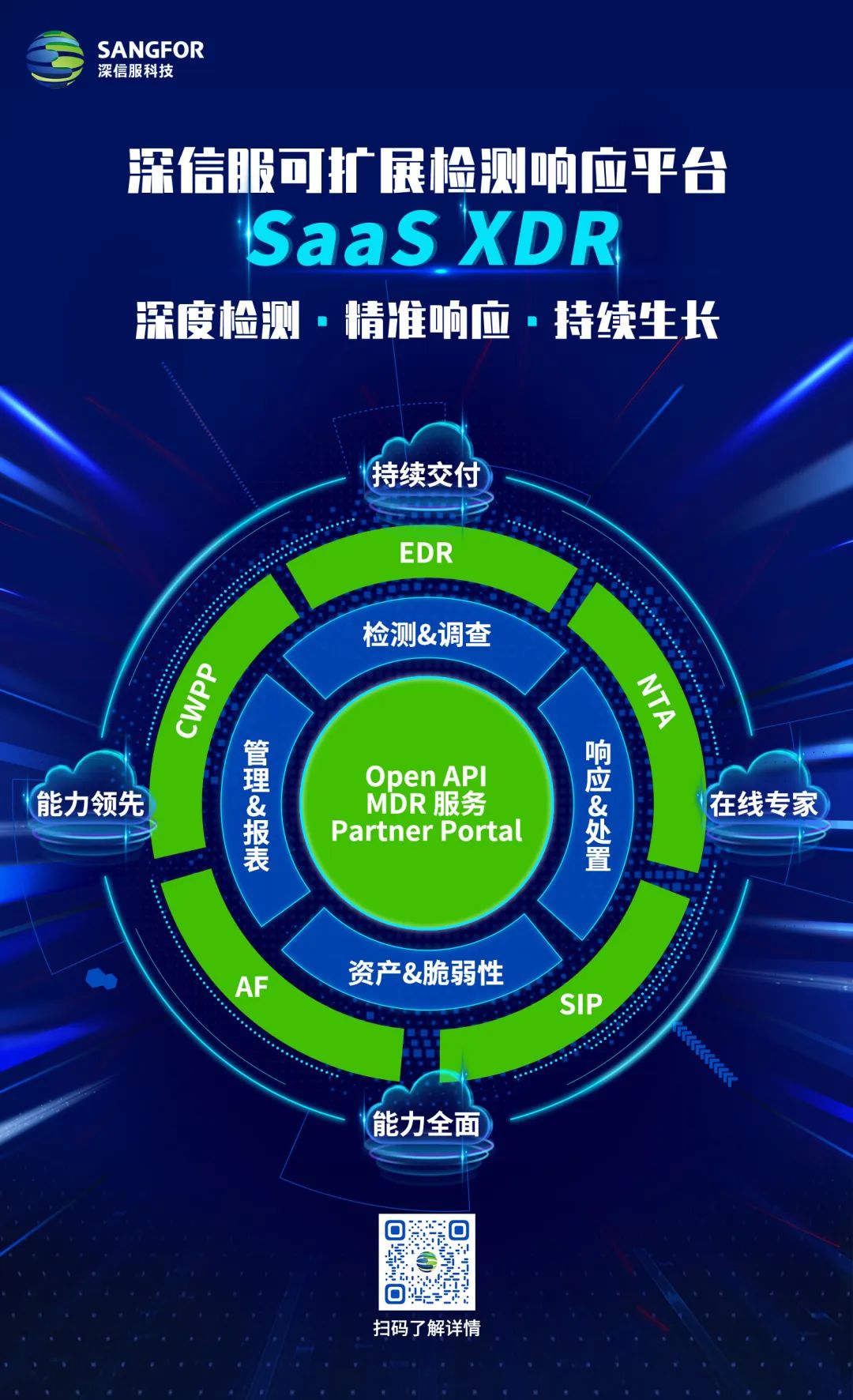 一種基于SaaS的安全威脅檢測和事件響應(yīng)平臺,通過原生的流量采集工具與端點采集工具將關(guān)鍵數(shù)據(jù)聚合,通過網(wǎng)端聚合分析引擎、上下文關(guān)聯(lián)分析,實現(xiàn)攻擊鏈深度溯源,結(jié)合托管檢測與響應(yīng)服務(wù)MDR,釋放人員精力;同時具備可擴展的接口開放性,協(xié)同SOAR等產(chǎn)品,化繁為簡,帶來深度檢測、精準(zhǔn)響應(yīng)、持續(xù)生長的安全效果體驗。